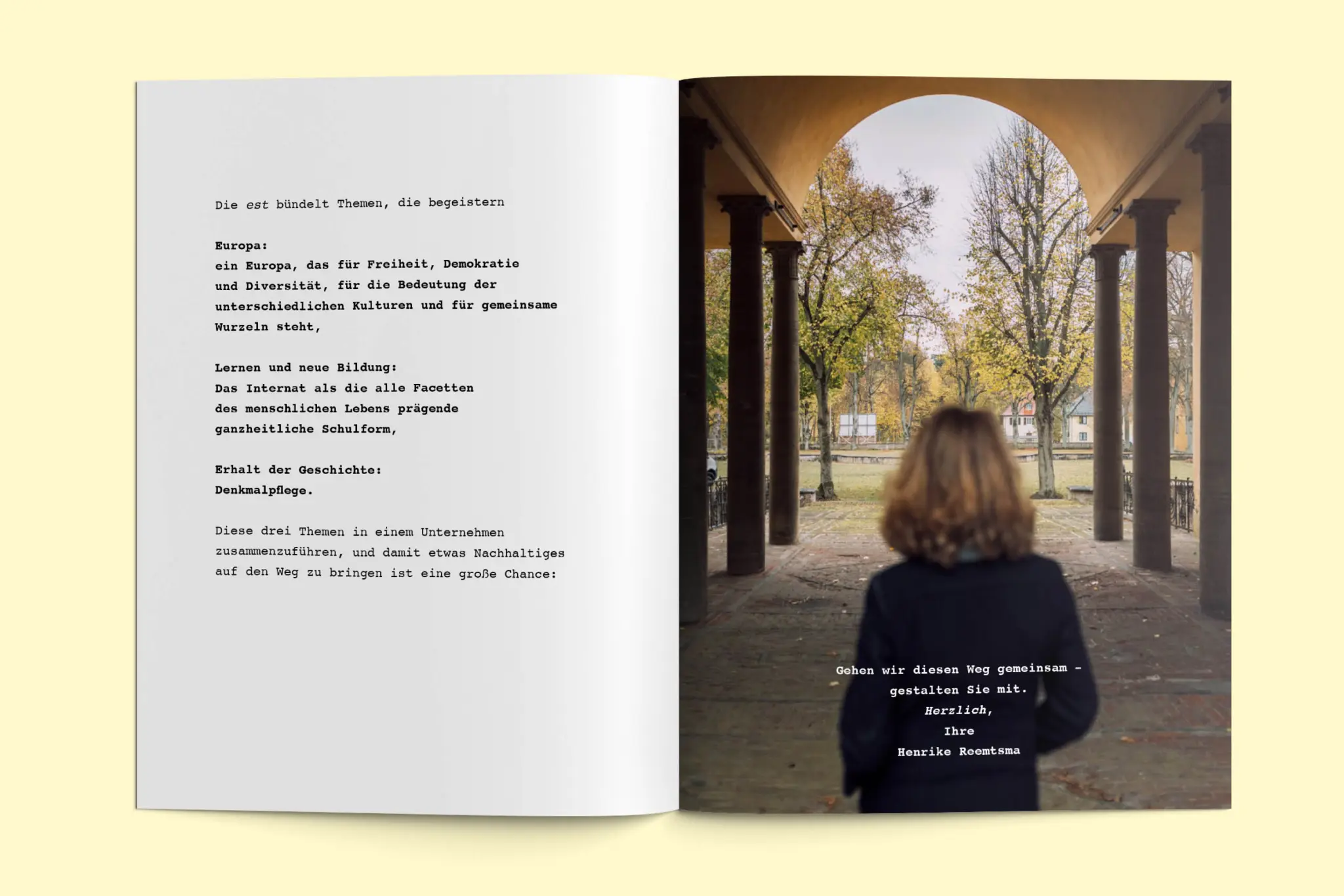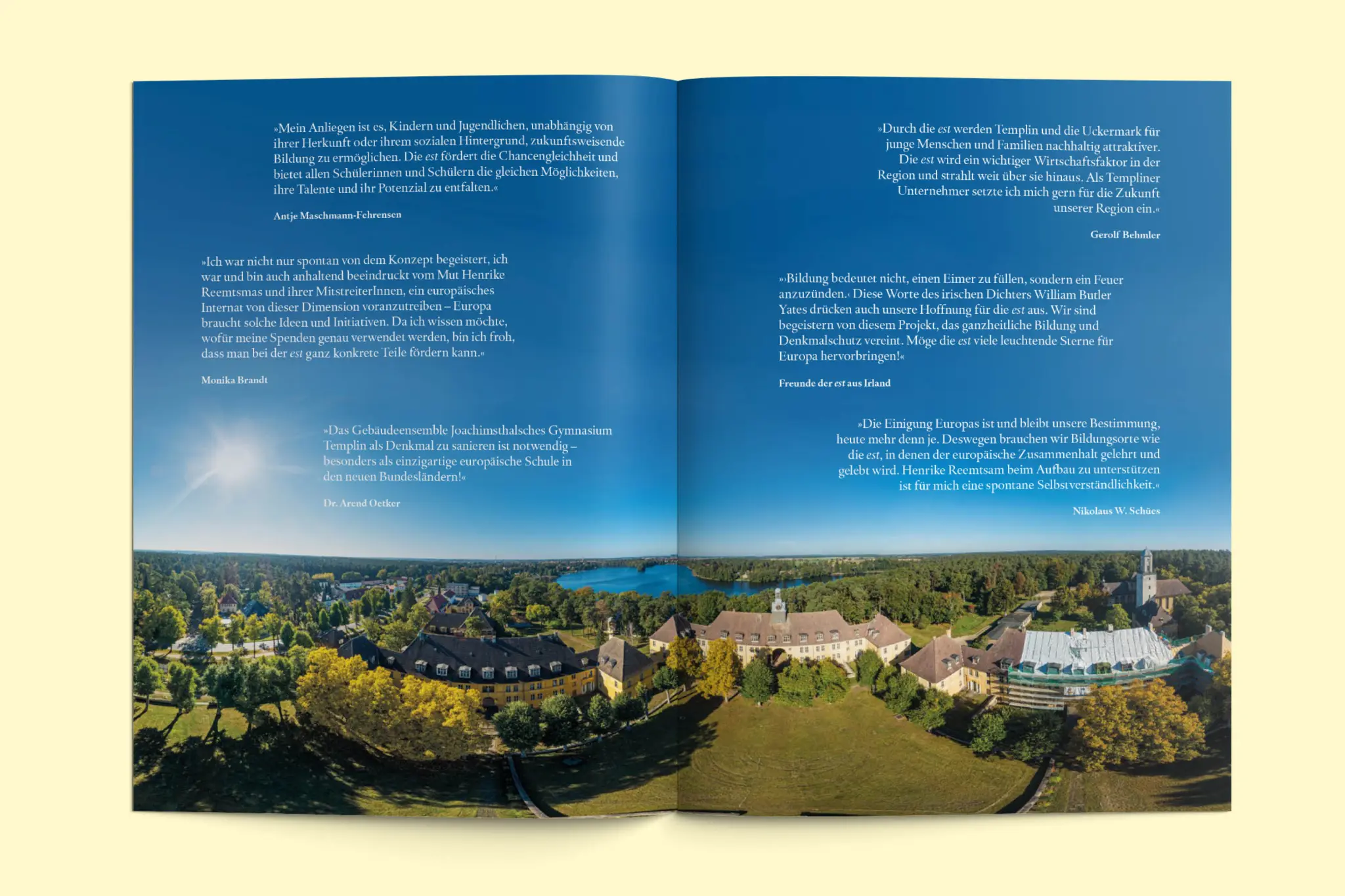 Wie aus einem privaten Ausflug eine Idee, aus einer Idee eine Stiftung, mit einer Stiftung die Welt ein Stück besser gemacht wird, erzählt diese Broschur über das Projekt einer modernen Europäischen Schule in grandiosen historischen Gebäuden. –> est.eu