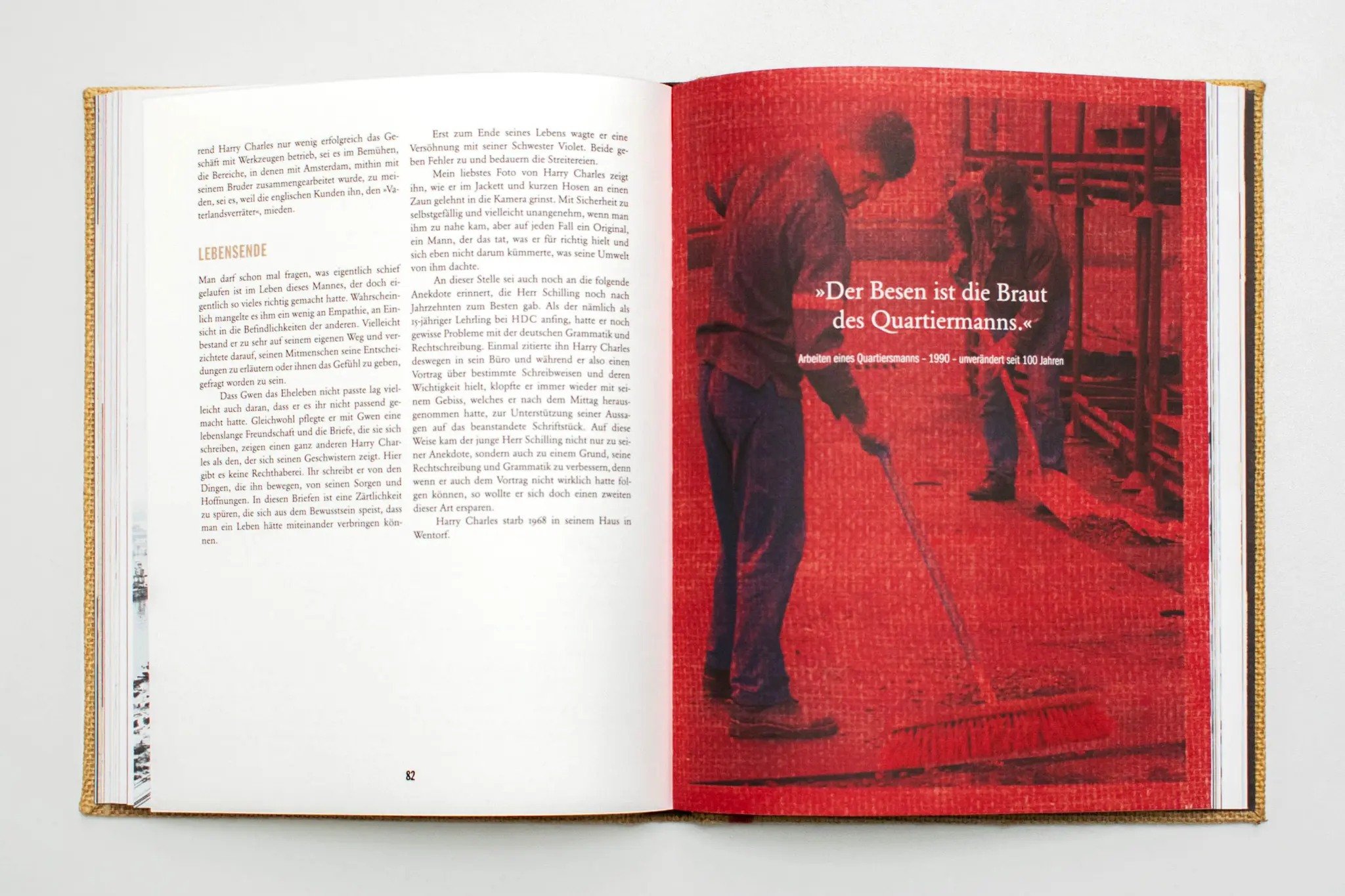 Anlässlich des Jubiläums der Firma H. D. Cotterell gestalteten wir dieses Buch im Original-Sackleinen-Einband, handverarbeitet. Die 128 Seiten erzählen von der spannenden Geschichte der Quartiersleute, illustriert mit vielen Fotos.