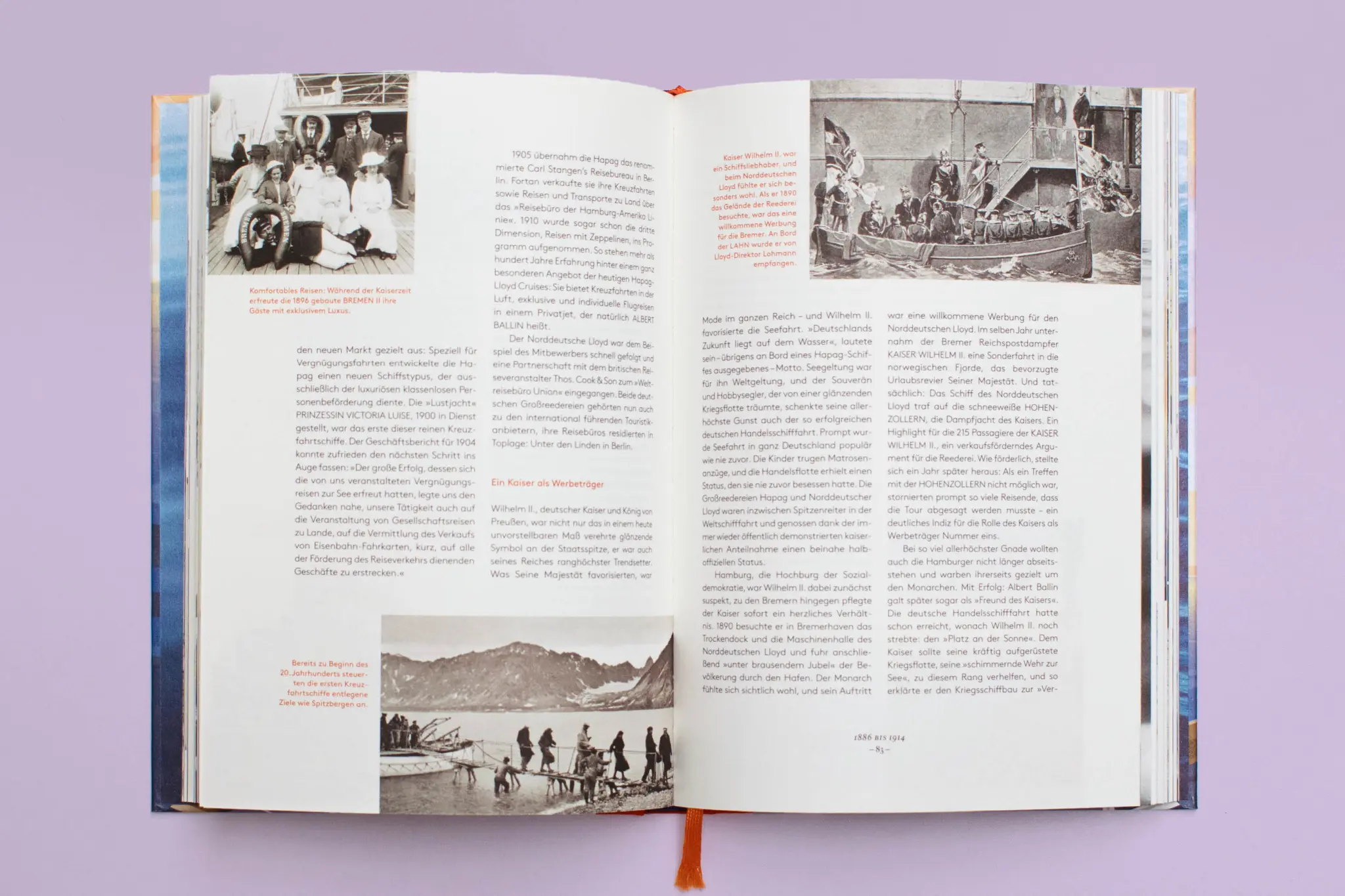 Originalbeiträge von Elke Heidenreich, über Daniel Kehlmann bis hin zu Gerald Hüther – Interviews und Reportagen zum Geschehen an Bord, eine umfangreiche Bebilderung und die aufwändige Ausstattung illustrieren die 125-jährige Geschichte der Hapag Lloyd Cruises.