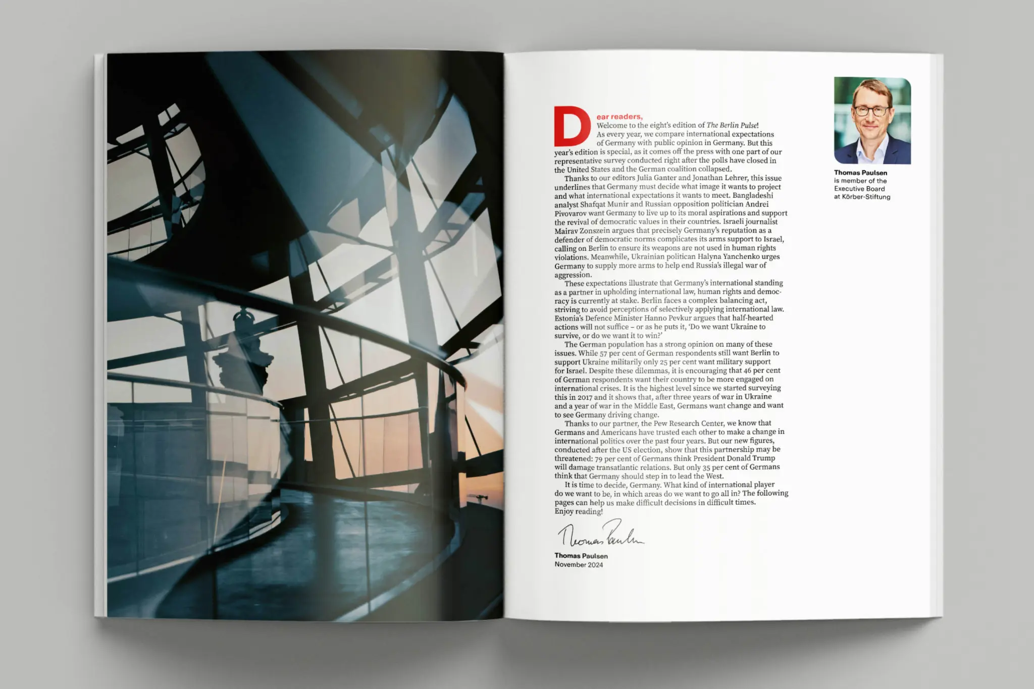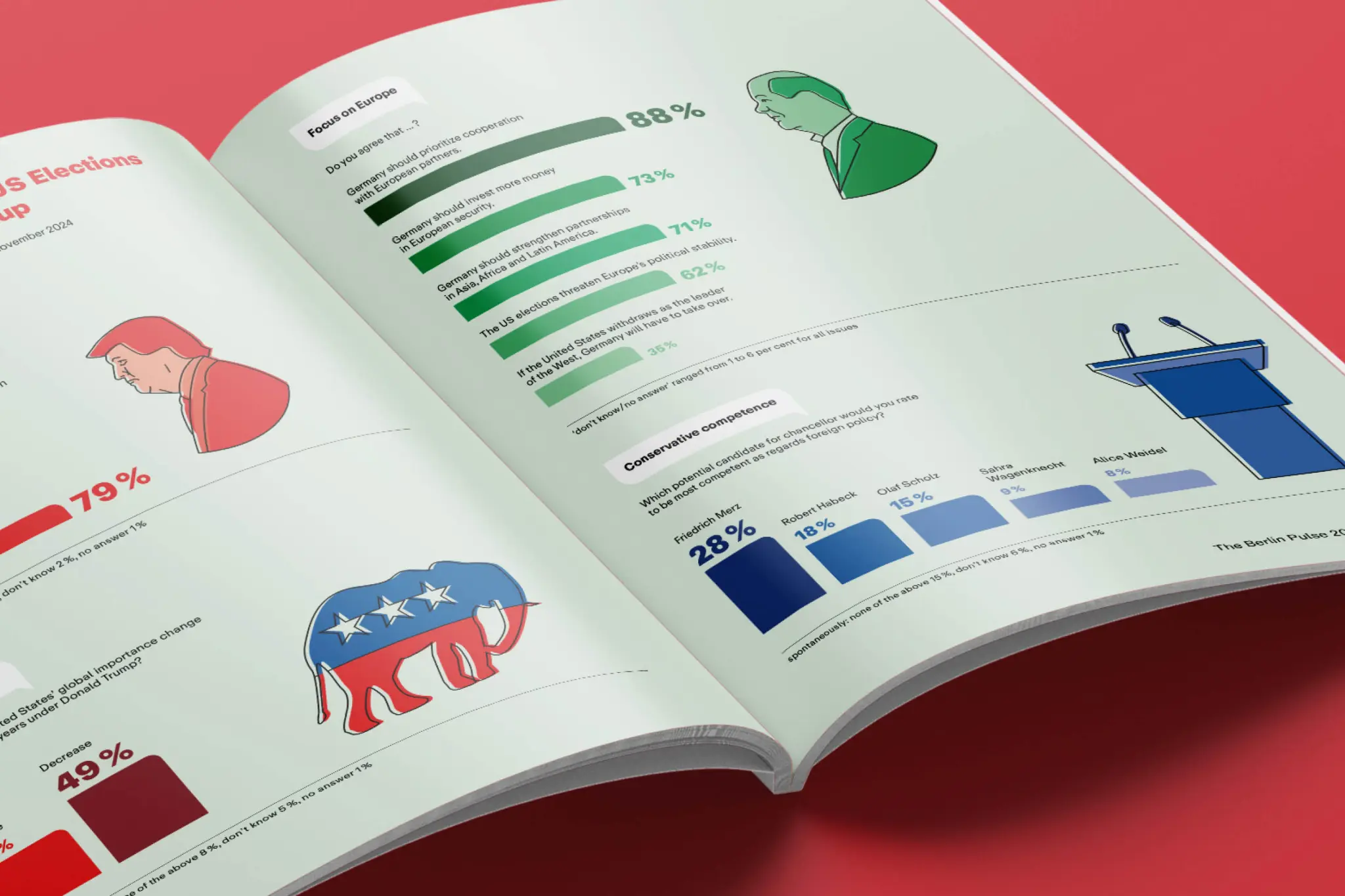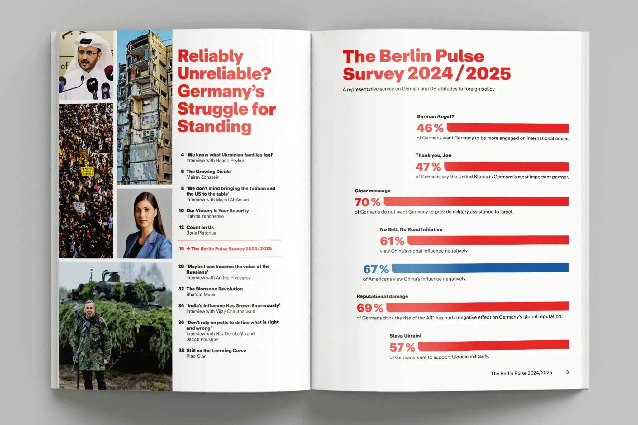 The Berlin Pulse thematisiert die drängendsten außen- und sicherheitspolitischen Themen aus unterschiedlichen Perspektiven. Beiträge hochrangiger internationaler Autorinnen und Autoren stehen einer jeweils aktuellen Meinungsumfrage zu den außenpolitischen Positionen der Deutschen gegenüber. Wir betreuen die jährlich erscheinende Publikation seit 2017.