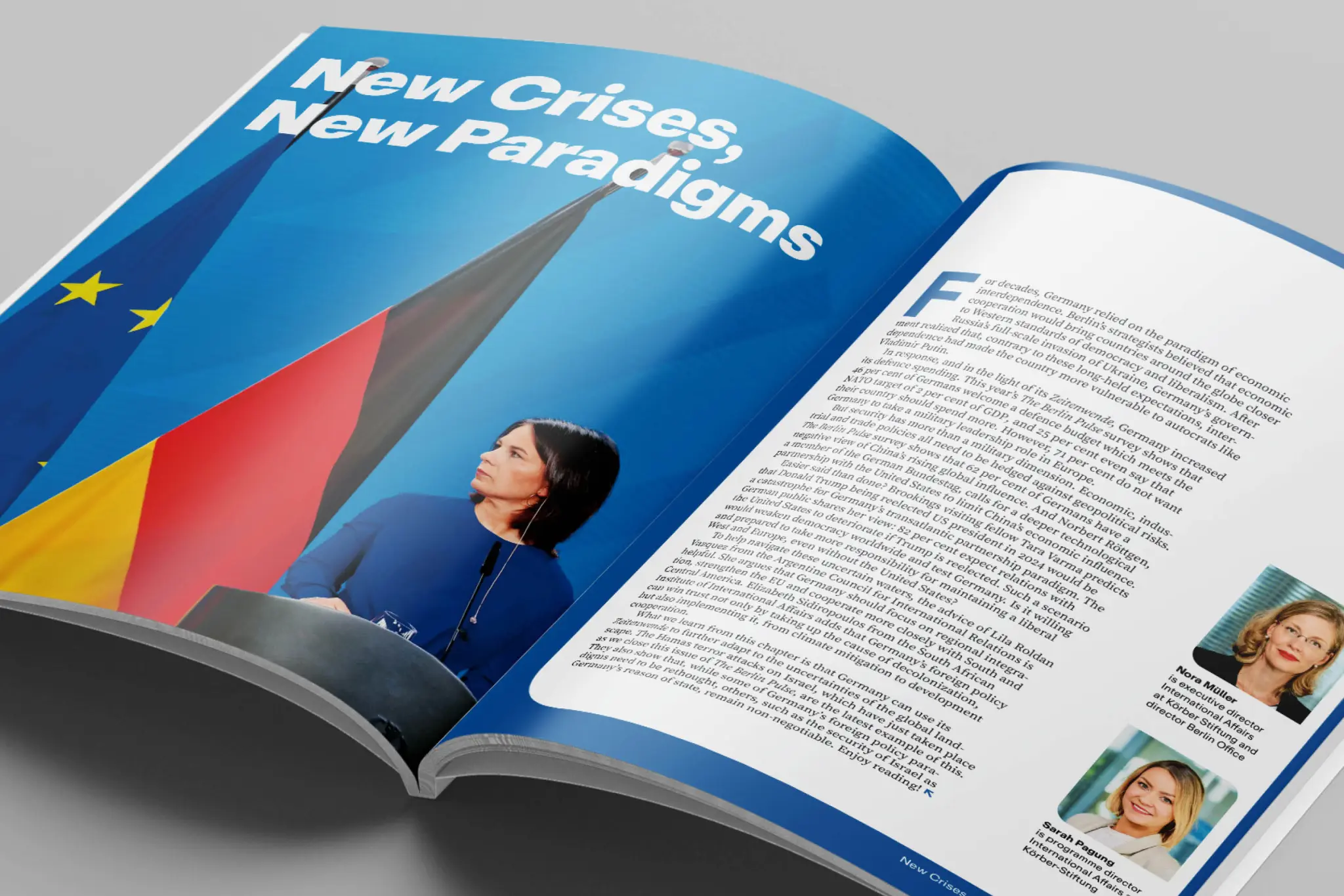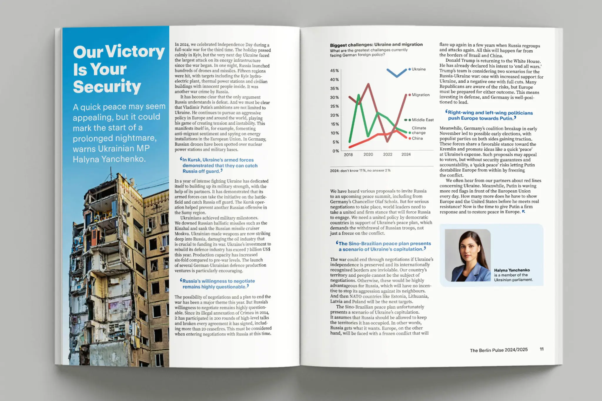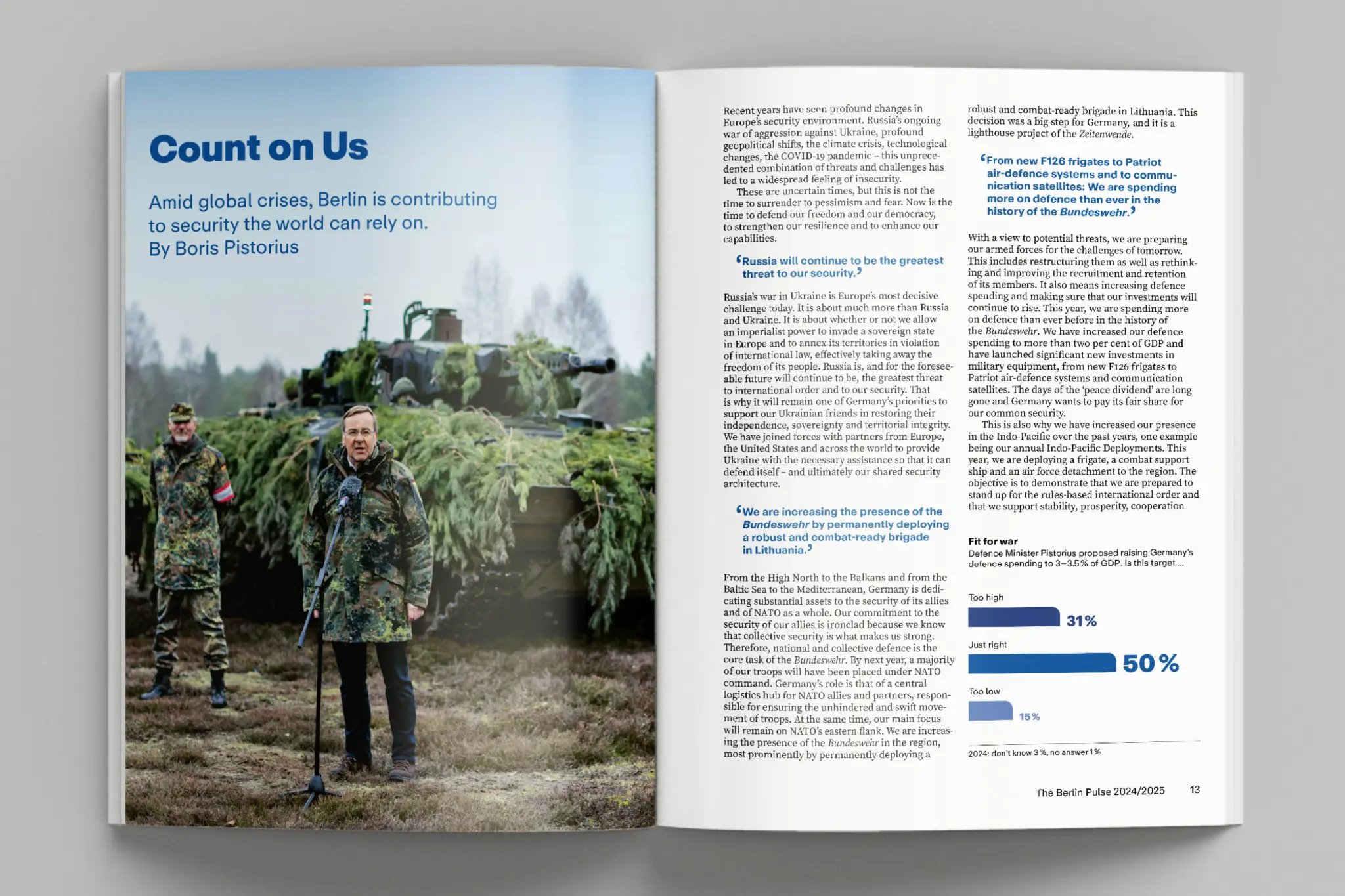 The Berlin Pulse thematisiert die drängendsten außen- und sicherheitspolitischen Themen aus unterschiedlichen Perspektiven. Beiträge hochrangiger internationaler Autorinnen und Autoren stehen einer jeweils aktuellen Meinungsumfrage zu den außenpolitischen Positionen der Deutschen gegenüber. Wir betreuen die jährlich erscheinende Publikation seit 2017.